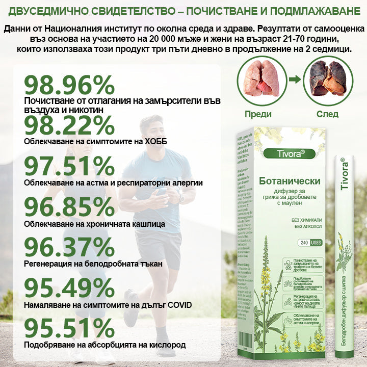 Ето истината: Тази кашлица, която имате днес, утре ще е по-лоша. Всеки ден, който отлагате, дробовете ви се увреждат все повече и стават по-трудни за възстановяване. Не сте по-млади, а дробовете ви не се лекуват сами. Но 94% от хората, които опитаха Tivora® Диффузер, се почувстваха по-добре само за 2 минути. След 4 седмици те започнаха да дишат лесно отново — без хапчета, без странични ефекти, без скъпи посещения при лекари. Вашите дробове се нуждаят от помощ сега. Не чакайте, докато е твърде късно.